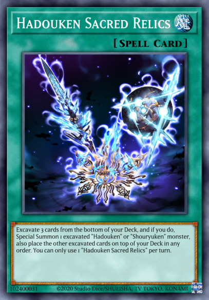 Excavate 3 cards from the bottom of your Deck, and if you do, Special Summon up to 2 excavated "Hadoken" monsters, also place the other excavated cards on top of your Deck in the same order. You can only activate 1 "Hadoken Sacred Relics" per turn.